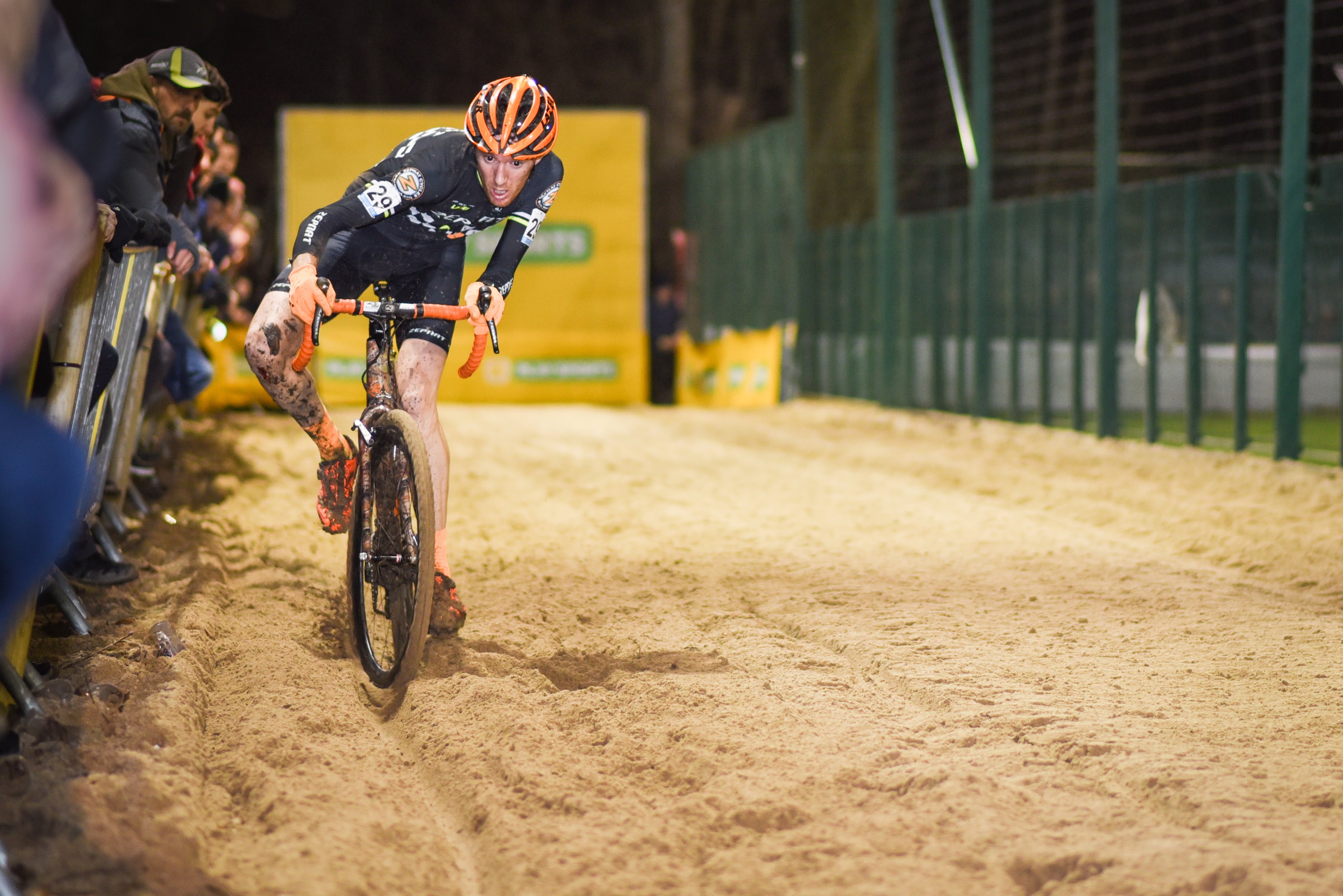 After the road start, there are a couple of hairpins and a bridge, followed by a gradual drag (over the only vaguely muddy/slippery bit of the course), before entering a sandy left-hander into De Kuil. After the first tricky descent is a run-up that some riders can make it up without dismounting. However, if you watch the 2018 footage you’ll see that Mathieu van der Poel went faster by dismounting than van Aert, who just managed to heave his bike over the lip of the climb. The next descent is a bit steeper than the first and is followed by a real slog of a run-up. After that, the fun escalates, with a fast descent that includes a jump for the show-offs, followed by a tricky turn over a hump where the leaders of the women’s race came to grief. After that a rutted left-hander onto the main climb of the race. This starts with what would usually be quite a tough section of sand (see 2013 and 2014 videos) but, after the snow, was really fast if you could hold your line. The climb steepens round a right-hander, where the surface also gets more gravelly (it feels a bit like the New Forest out on this bit of the course), before dropping down to the infamous sandy left-hander. The nature of the sand changes for this part of the course. It becomes sticky – a bit like the kind of sand used for making moulds to cast metal. In some ways this makes it easier, with ruts flattening out more nicely, but it’s game over if you stall or come out of the rut. Once to the top of the run-up (or ride-up if you are one of the top three riders in the world), the fun starts again, with a long flowing descent to the finish. It’s punctuated by a few sharp corners and the odd sand trap. The corners develop quite viscous ruts which aren’t apparent on the TV. I followed Dan Tullet down this descent and it quickly became apparent that he’d done this kind of thing before!